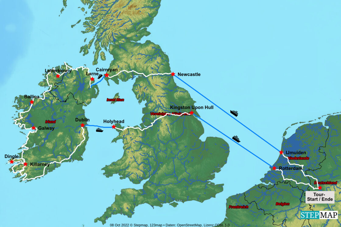 Während der Überfahrt genießen wir die entspannte Atmosphäre an Bord, lassen die Eindrücke der Fahrt Revue passieren und stimmen uns auf die kommenden Tage auf der Grünen Insel ein. Mit der Ankunft in Larne beginnt unser Irland-Abenteuer, das uns durch einige der schönsten Motorradregionen Europas führen wird. Tagesetappe: ca. 280 km